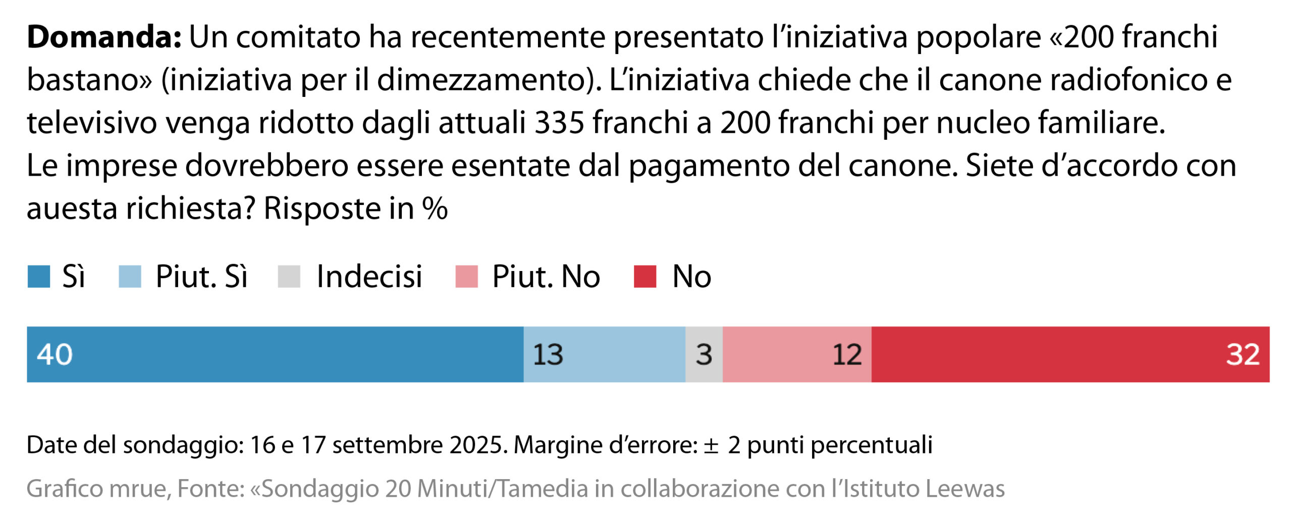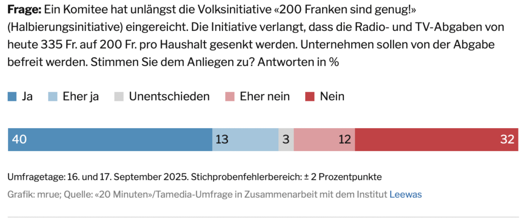 Anche se la qualità della SSR lascia spesso molto a desiderare, la popolazione svizzera paga il canone di ricezione obbligatorio più alto del mondo (!), attualmente 335 franchi, indipendentemente dall’apparecchio. Con l'iniziativa, dobbiamo pagare solo 200 franchi. Sempre ancora sufficienti!